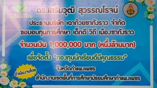 เพื่อเป็นการส่งเสริมให้การดำเนินงานของโครงการส่งเสริมคุณธรรม ศีลธรรมนำการศึกษา บริษัท เฉาก๊วยชากังราว จำกัด จึงสนับสนุนงบประมาณ จำนวนเงิน 1 ล้านบาท เพื่อจัดตั้งกองทุนนักเรียนดีมีคุณธรรม สำนักงานเขตพื้นที่การศึกษามัธยมศึกษากำแพงเพชรขึ้น เพื่อช่วยเหลือนักเรียนที่ด้อยโอกาสทางการศึกษาที่ตกอยู่ในสภาวะยากลำบาก เด็กที่มาจากครอบครัวยากจน และเป็นเด็กดี มีคุณธรรม เป็นนักเรียนผู้มีความรักชาติ ศาสนา พระมหากษัตริย์ มีคุณธรรม ศีลธรรม มีความกตัญญูกตเวที เป็นผู้นำทางด้านศาสนพิธี ทีมข่าวขออนโมทนา ขอให้ บริษัท เฉาก๊วยชากังราว จำกัด มีความเจริญยิ่งๆขึ้นไป