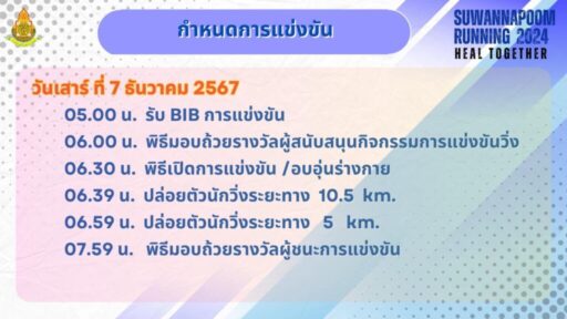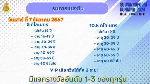 จึงขอเชิญทุกท่านเข้าร่วมการแข่งขันเดิน-วิ่ง ครบรอบ 72 ปี เยือนถิ่นเก่าชาว แสด-ฟ้า โดยการเดินเดิน-วิ่งครั้งนี้ ได้กำหนดขึ้นในวันเสาร์ที่ 7 ธันวาคม 2567 ปล่อยตัวเวลา 06.39 น. แบ่งรุ่นการแข่งขันออกเป็น 5 กิโลเมตรและ 10.5 กิโลเมตร แยกตามรุ่นอายุและ และผู้สมัครประเภทVIP โดยมีเสื้อสวยงาม เหรียญที่ระลึกและถ้วยรางวัลมอบให้แก่ ผู้เข้าร่วมกิจกรรมและชนะการแข่งขันตามประกาศที่กำหนด