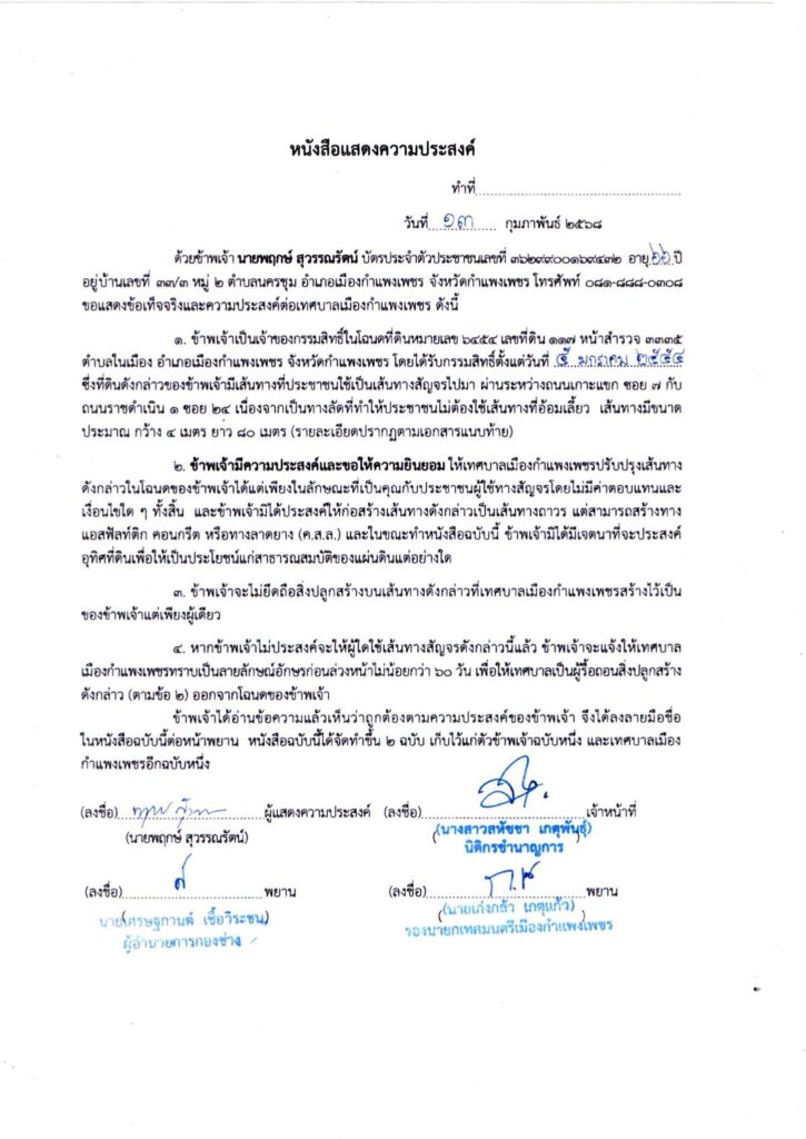 เนื่องด้วยเทศบาลเมืองกำแพงเพชร ได้ปรับปรุงเส้นทางดังกล่าว ในโฉนดที่ดินของ นายพฤกษ์ สุวรรณรัตน์ โดยเจ้าของที่ดินมิได้ประสงค์ให้ก่อสร้างเส้นทางดังกล่าวเป็นเส้นทางถาวร แต่สามารถสร้างเป็นทางแอสฟัลท์ติกคอนกรีต (ค.ส.ล.) หรือทางลาดยางได้ ซึ่งนายพฤกษ์ สุวรรณรัตน์ เจ้าของที่ดิน มิได้มีเจตนาที่จะประสงค์อุทิศที่ดินเพื่อให้เป็นประโยชน์แก่สาธารณสมบัติของแผ่นดินแต่อย่างใด แต่ยินยอมให้เทศบาลเมืองกำแพงเพชร ทำการปรับปรุงเส้นทางดังกล่าว แต่เพียงในลักษณะที่เป็นคุณแก่ประชาชน ผู้ใช้เส้นทาง โดยไม่มีค่าตอบแทนและเงื่อนไขใดๆทั้งสิ้น