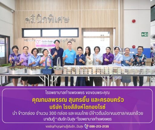 เมื่อวันที่ 22 คุณกมลพรรณ สุนทรยิ้ม “เจ้อิ้ง” พร้อมครอบครัว บริษัทในเครือ สิงห์โตทอง กรุ๊ป ได้นำอาหารกล่องที่ปรุงเองจาก “ครัวมาดาม” จำนวนกว่า 300 กล่อง พร้อมด้วยขนมไทยนานาชนิด อาทิ ข้าวต้มมัด ขนมตาล และขนมกล้วย ไปมอบให้แก่ โรงพยาบาลกำแพงเพชร เพื่อเติมลงใน “ตู้เติมรัก ปันสุข” เนื่องในโอกาสวันคล้ายวันเกิด