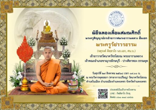 พิธีในครั้งนี้ได้รับเกียรติจาก นายชาธิป รุจนเสรี ผู้ว่าราชการจังหวัดกำแพงเพชร เป็นประธานฝ่ายฆราวาส อ่านพระบัญชาสมเด็จพระอริยวงศาคตญาณ สมเด็จพระสังฆราช สกลมหาสังฆปริณายก ที่ทรงวินิจฉัยตามมติมหาเถรสมาคมให้มีการเลื่อนสมณศักดิ์ โดยมี พระสุนทรวชิราจารย์ เจ้าคณะจังหวัดกำแพงเพชร-พิจิตร (ธ) เจ้าอาวาสวัดไพรสณฑ์รัตนาราม อ.คลองลาน เป็นประธานฝ่ายสงฆ์