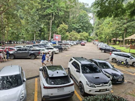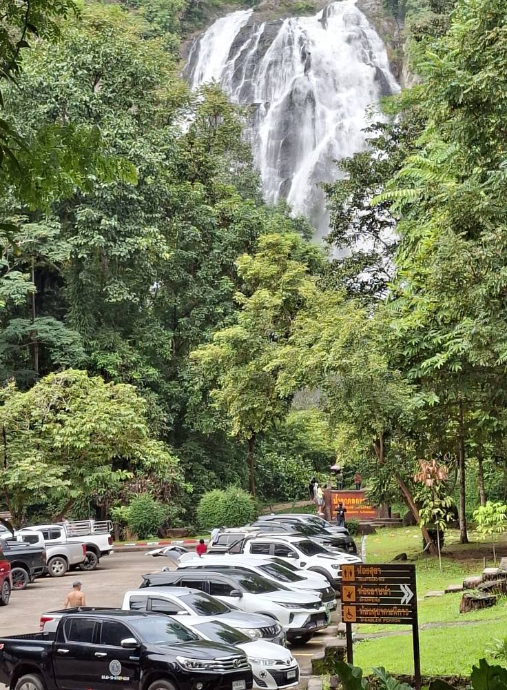 ส่วนบริเวณ ลานจอดรถ ก็แน่นขนัดไปด้วยรถยนต์ของนักท่องเที่ยวที่เดินทางมาแบบวันเดียวและพักค้างคืน เจ้าหน้าที่อุทยานได้จัดเจ้าหน้าที่ดูแลความเรียบร้อย รวมถึงประชาสัมพันธ์ให้ช่วยกัน รักษาความสะอาด เก็บขยะให้ถูกที่ เพื่อคงไว้ซึ่งความงดงามของธรรมชาติที่เป็นเอกลักษณ์ของน้ำตกคลองลาน