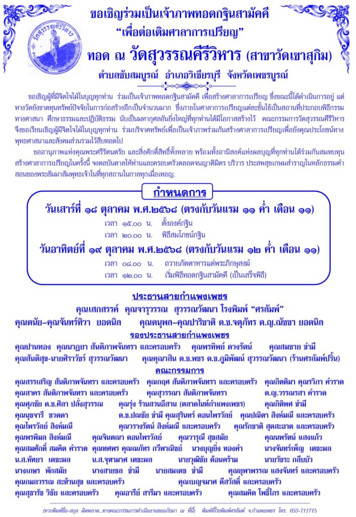 19 ต.ค.2568 ทอดกฐินที่วัดสุวรรณคีรีวิหาร ต.ซับสมบูรณ์ อ.วิเชียร จ.เพชรบูรณ์ (และตั้งโรงทานก๋วยเตี๋ยว+ทอดปาท่องโก๋)