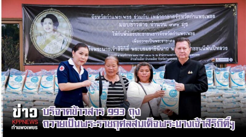 วันที่ 7 พฤศจิกายน 2568 เวลา 09.00 น. ที่บริเวณ ลานด้านหน้าสำนักงานเหล่ากาชาดจังหวัดกำแพงเพชร จังหวัดกำแพงเพชร ร่วมกับเหล่ากาชาดจังหวัดกำแพงเพชร จัดกิจกรรมมอบข้าวสารให้กับประชาชนจำนวน 993 ถุง เพื่อ ถวายเป็นพระราชกุศลแด่สมเด็จพระนางเจ้าสิริกิติ์ พระบรมราชินีนาถ พระบรมราชชนนีพันปีหลวง และเพื่อ แสดงออกถึงความจงรักภักดีต่อสถาบันพระมหากษัตริย์
