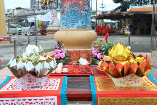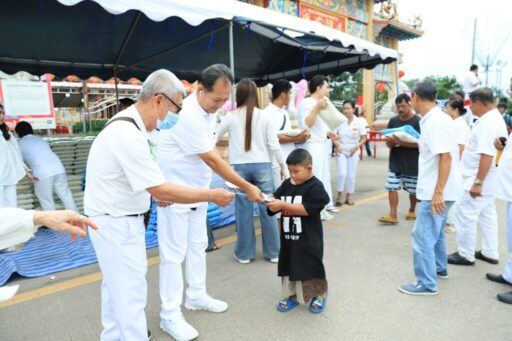 หลังเสร็จพิธี ทางศาลเจ้าได้นำเครื่องเซ่นไหว้และสิ่งของที่จัดเตรียมไว้กว่า 1,000 ชุด พร้อม อาหารคาวบรรจุถุง ออกแจกทานแก่ประชาชนผู้ยากไร้ ผู้สูงอายุ และครอบครัวในชุมชน เพื่อบรรเทาความเดือดร้อนและเป็นการสืบสานเมตตาธรรม