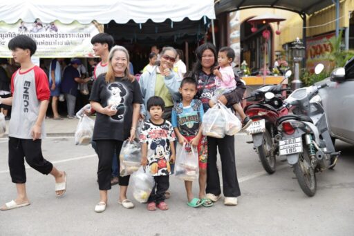 หนึ่งในกิจกรรมสำคัญของวันนี้ คือการจัด โรงทานอาหารฟรี เพื่อช่วยเหลือประชาชนในพื้นที่และส่งเสริมการทำความดีร่วมกัน อาสาสมัครของมูลนิธิฯ ได้รวมตัวกันตั้งแต่ช่วงเช้า เพื่อเตรียมวัตถุดิบและปรุงอาหารปริมาณมาก โดยเมนูหลัก ได้แก่ ข้าวผัด ผัดไทย ผัดซีอิ๊ว ทั้งหมดปรุงด้วยกระทะขนาดใหญ่เพื่อให้เพียงพอต่อการแจกจ่าย พร้อมบรรจุกล่องอย่างเรียบร้อย และมีน้ำดื่มรวมถึงสิ่งของบริจาคอื่น ๆ มอบให้ประชาชนบริเวณด้านหน้าอาคารมูลนิธิ โดยมีประชาชนในชุมชนเทศบาลเมืองกำแพงเพชร มาร่วมรับอาหารจำนวนมาก