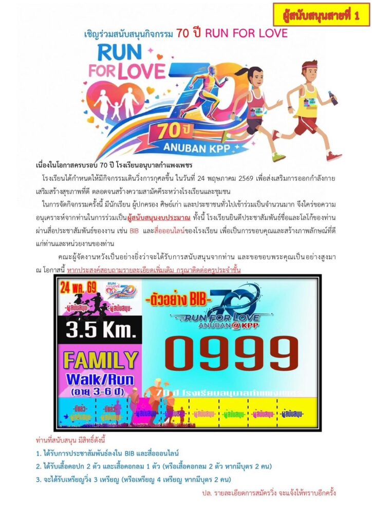 70 ปี กิจกรรม เดินวิ่ง 70 ปี run for love โรงเรียนอนุบาลกำแพงเพชร