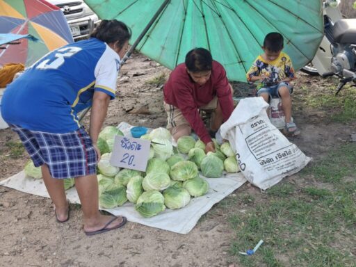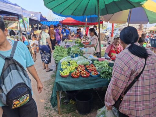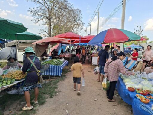 ภาพบรรยากาศ ตลาดนัดยามเย็น คึกคักไปด้วยผู้คนที่มาเดินเลือกซื้อผักสดและของกินหลากหลายชนิด แผงผักสดวางเรียงแน่น ทั้งผักบุ้ง คะน้า ผักกาด กะหล่ำปลี มะเขือ ถั่วฝักยาว และผักพื้นบ้านต่าง ๆ บรรจุใส่ถุงใสอย่างเป็นระเบียบ มีเครื่องชั่งวางอยู่บนโต๊ะสำหรับชั่งขาย ลูกค้าหลายคนยืนเลือกซื้อสินค้า บางคนถือถุงกับข้าวอยู่ในมือ แม่ค้าสวมหมวกและผ้าคลุมกันแดด กำลังจัดผักและให้บริการลูกค้า รอบ ๆ มีร่มผ้าใบสีฟ้าและสีชมพูขนาดใหญ่กางเรียงกันเพื่อบังแดดยามบ่าย บรรยากาศดูเป็นกันเองแบบตลาดชุมชน ผู้คนแต่งกายสบาย ๆ บางคนสวมหน้ากากอนามัย ภาพรวมสะท้อนถึงวิถีชีวิตเรียบง่ายของชุมชน ที่มาจับจ่ายเลือกซื้อของสดใหม่ในช่วงเย็นอย่างคึกคักและอบอุ่น 🌿🥬🥕
