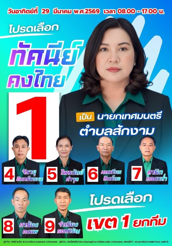 ทั้งนี้ คุณทัศนีย์ คงไทย ได้เชิญชวนพี่น้องประชาชนผู้มีสิทธิเลือกตั้งในเขตเทศบาลตำบลสักงาม ออกมาใช้สิทธิเลือกตั้งกันอย่างพร้อมเพรียง เพื่อร่วมกำหนดทิศทางการพัฒนาท้องถิ่น โดยใน วันอาทิตย์ที่ 29 มีนาคม 2569 ขอเชิญประชาชนเข้าคูหา กากบาทเลือก “หมายเลข 1” และเลือกสมาชิกสภาเทศบาลในทีม โดย
